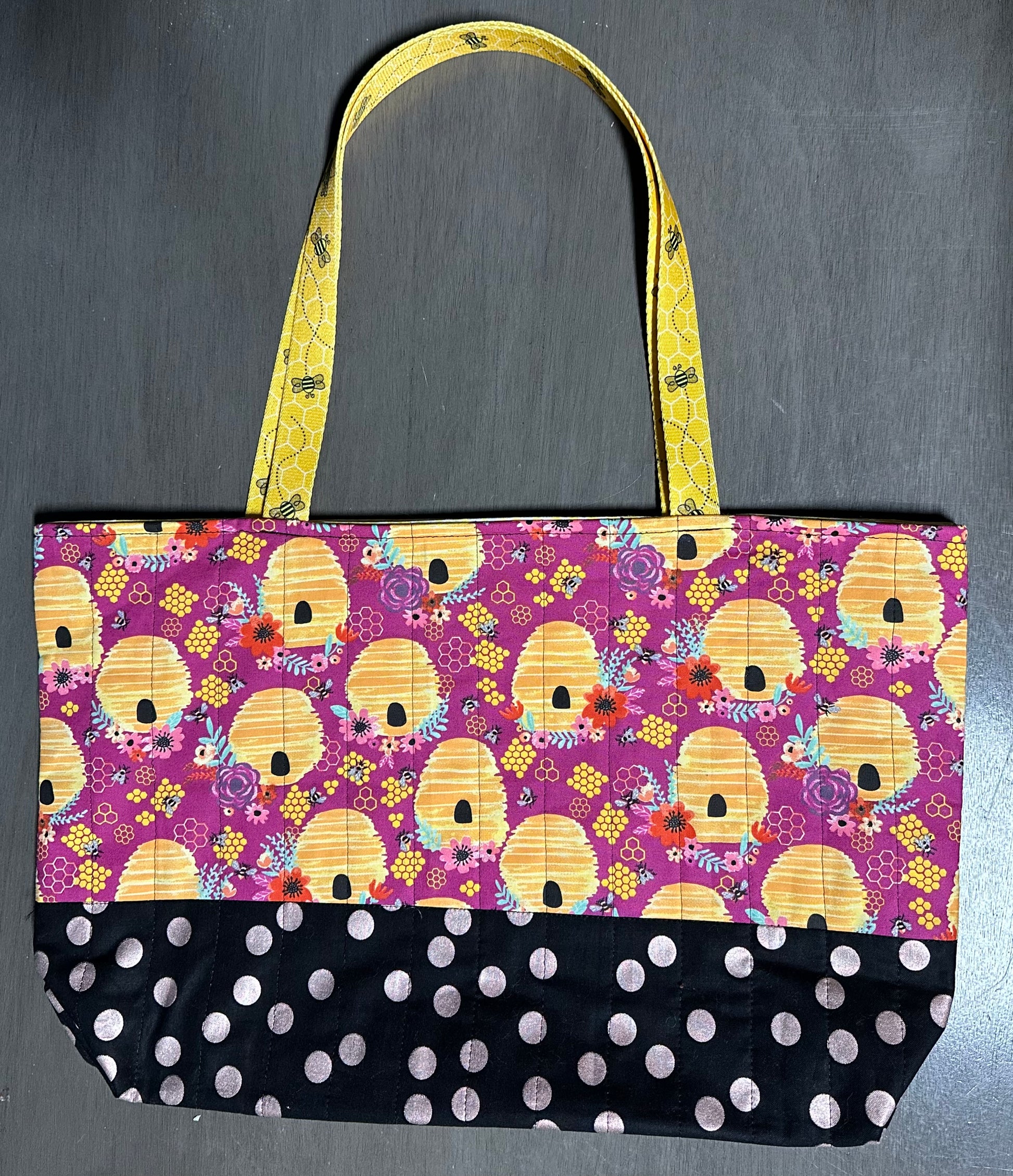 - Handles: Coordinating yellow bee print, long enough to carry over the shoulder