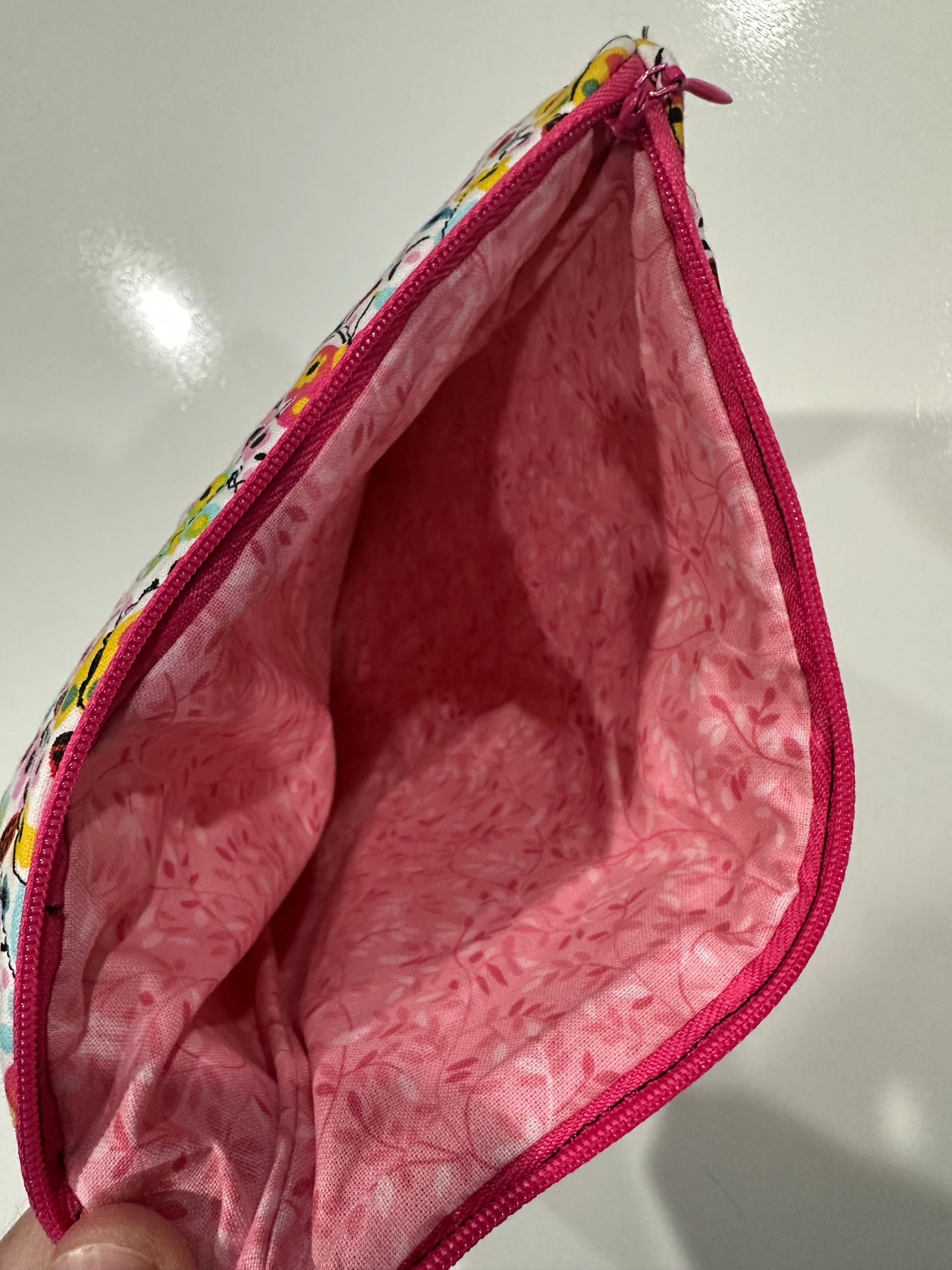 Stay organized in style with this handmade quilted zipper pouch, featuring a bright butterfly and ladybug print on the outside and a soft pink floral lining inside. Perfect for carrying cosmetics, craft supplies, electronics, or everyday essentials, this pouch can also be personalized with your name or a short phrase for a one-of-a-kind gift.